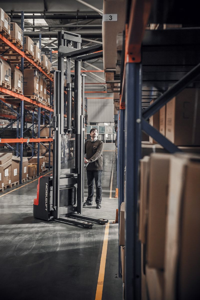 Die lange seitlich positionierte Deichsel ermöglicht es dem Bediener stets einen sicheren Abstand zum Stapler zu halten, was die Arbeitssicherheit erhöht und die Bedienung beim Stapeln und beim Fahren erleichtert.