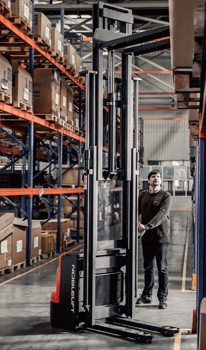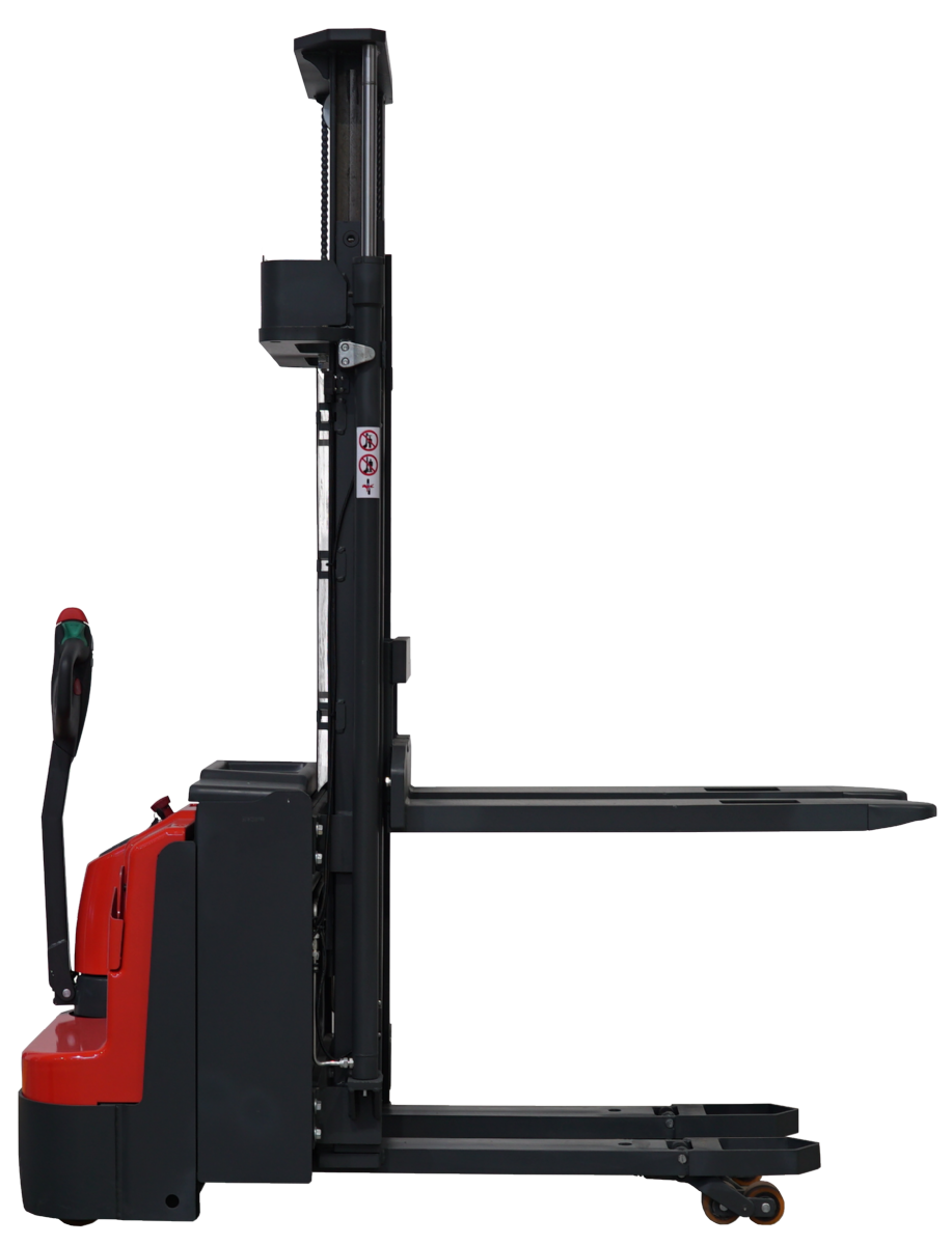 Des Weiteren ist durch den schmalen Mast eine gute Sicht auf die Gabelzinken gegeben, wodurch die Sicherheit für den Bediener als auch für nebenstehende Personen erhöht wird. Die lange seitlich positionierte Deichsel ermöglicht dem Bediener stets einen sicheren Abstand zum Stapler zu halten, was die Arbeitssicherheit erhöht und die Bedienung beim Stapeln sowie beim Verfahren erleichtert.