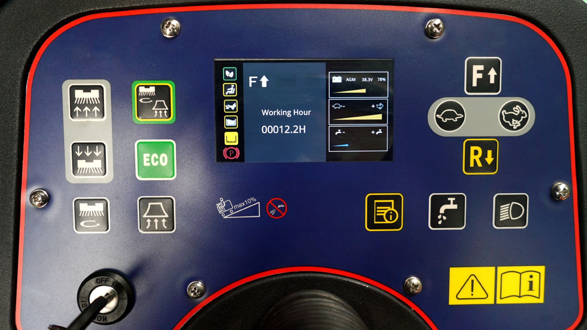 Mittig auf dem Display ist zusätzlich ein kleiner Bildschirm integriert, der die Arbeitsstunden, die Fahrgeschwindigkeit, oder auch den Batterriestand anzeigt, wodurch eine bequeme Bedienung gefördert wird.